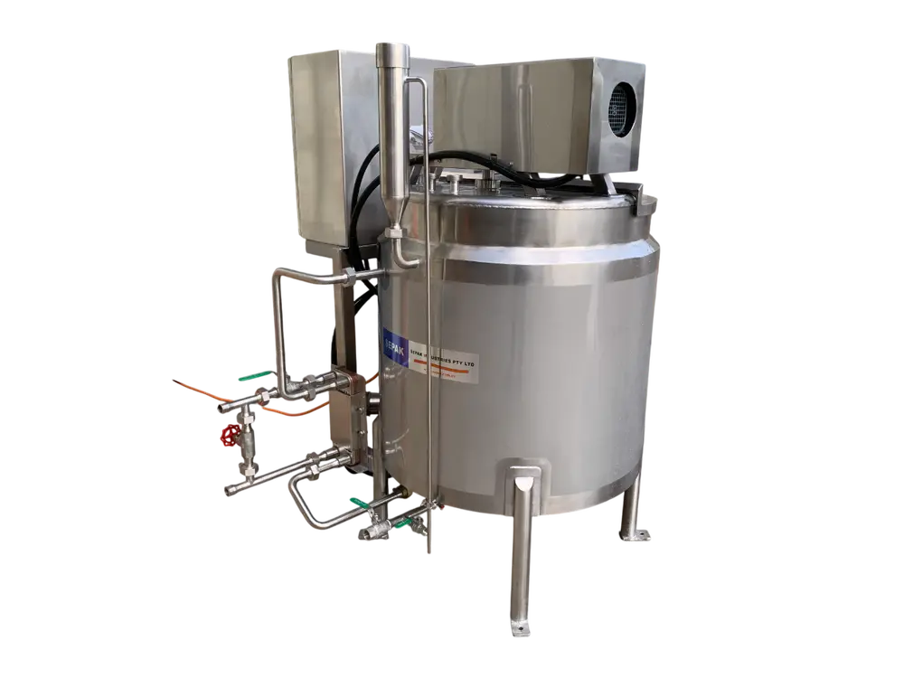 SS316 stainless steel product-contact surfaces Integrated electric heating with recirculation pump for efficient heat transfer Digital temperature control with optional touchscreen display Variable-speed agitator for blending and stirring Built-in data logging system for process tracking CIP-ready design with internal spray ball for easy cleaning Available in 250L, 500L, and 1000L capacities (custom sizes available)